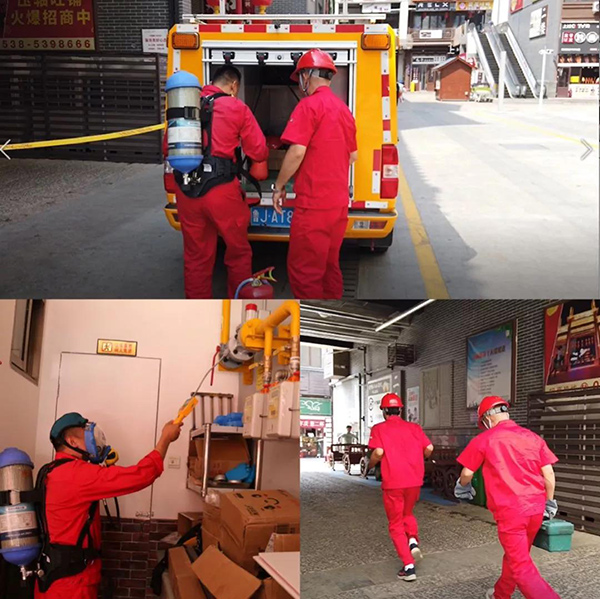 安泰燃氣調(diào)度室在接到“燃氣泄漏”報警后,立即向用戶部、管網(wǎng)部下達應急搶險指令,經(jīng)向公司應急總指揮報告后立即啟動了《下游用戶燃氣泄漏現(xiàn)場處置方案》。各應急小組接到指令后立即趕赴“現(xiàn)場”,使用遠程激光遙感監(jiān)測儀對發(fā)生泄漏的周圍環(huán)境進行監(jiān)測并確定燃氣擴散濃度情況;通過設置警戒疏散區(qū)域、使用手持高音喇叭擴音器立即大聲喊話“現(xiàn)在發(fā)生生燃氣泄漏,請所有商戶、游客緊急撤離”、吹響高音哨子進行示警;同時與老街商管人員聯(lián)合對商戶、游客進行緊急疏散。隨后安泰燃氣專業(yè)搶險隊員到達現(xiàn)場,穿防靜電服、佩戴正壓式呼吸器進入燃氣“泄漏”現(xiàn)場,使用高精度燃氣檢漏儀對商戶內(nèi)進行燃氣濃度檢測,經(jīng)檢測燃氣濃度符合安全標準后,立即對該商戶的燃氣設施進行排查,對泄漏點進行維修處置,確認安全后,按程序恢復供氣。