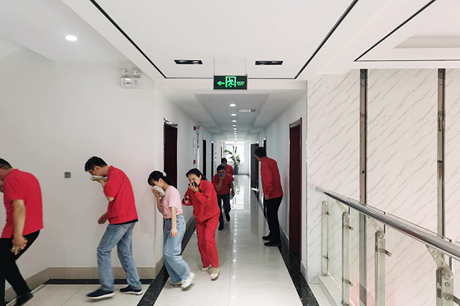 公司首先在辦公樓進(jìn)行了消防疏散演習(xí)。上午8:30,隨著警報(bào)響起,撤離命令第一時(shí)間由專(zhuān)人傳達(dá)至辦公樓每個(gè)在崗員工,大家立即沿著指定路線快速疏散,有序撤離到安全地帶。
