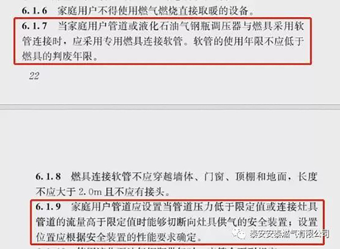 細(xì)心閱讀會(huì)發(fā)現(xiàn)其中第6.1.7條款對(duì)于燃?xì)膺B接軟管的要求出現(xiàn)了很大的新變化:“當(dāng)家庭用戶管道或液化石油氣鋼瓶調(diào)壓器與燃具采用軟管連接時(shí),應(yīng)采用專用燃具連接軟管。軟管的使用年限不應(yīng)低于燃具的判廢年限”。